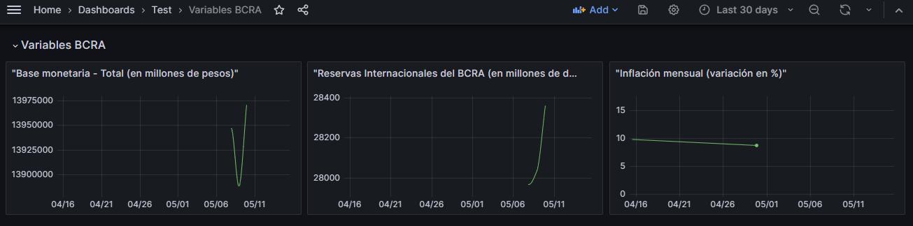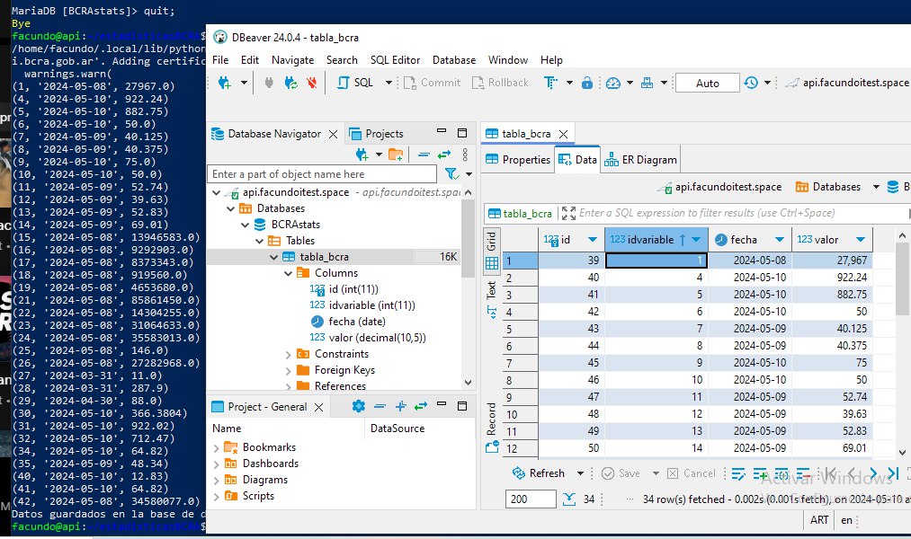 The Python script is an application designed to fetch data from the BCRA API and store it in the MySQL database created with the aforementioned SQL command. It utilizes the mariadb library to establish a connection to the MySQL database and the requests library to make HTTP requests to the BCRA API. The script retrieves JSON data from the API, processes it, and inserts relevant information into the MySQL database table. Additionally, it includes error handling to manage potential issues with the API request or JSON decoding.