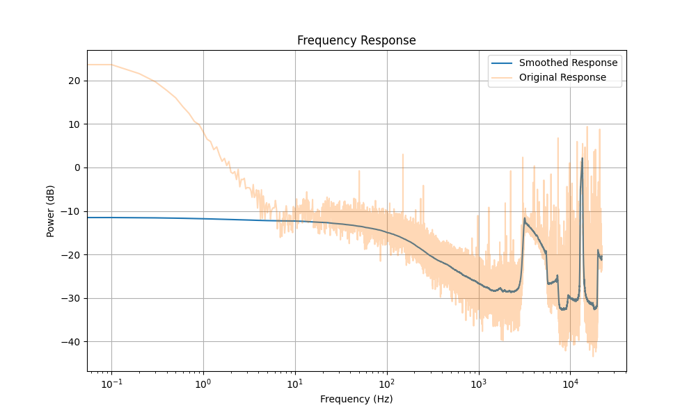 - `analyze_frequency_response` calcula la potencia de la señal grabada para cada frecuencia del barrido. Este método asume que la frecuencia cambia logarítmicamente con el tiempo durante el barrido.
