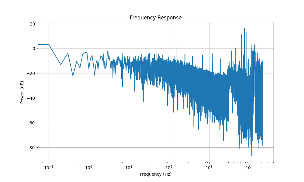 - `plot_frequency_response` grafica la potencia en función de la frecuencia, utilizando una escala logarítmica para el eje de las frecuencias.