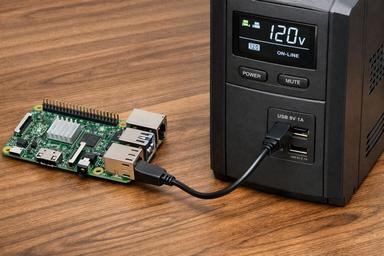 😅 This image was created in May 2024, using Bing AI. Apparently it struggles a bit with the cable routing… ToDo: create this same prompt (raspberry pi connected to an UPS using an USB cable, photorealistic) in a couple of years.