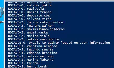 # Import Active Directory module Import-Module ActiveDirectory # Get the list of Active Directory computers with names starting with 'BOIAVD' $computers = Get-ADComputer -Filter 'Name -like "BOIAVD*"' -Property Name | Select-Object -ExpandProperty Name # Function to get logged-on users via explorer.exe process function Get-LoggedOnUsers { param ( [string]$computerName ) try { # Get explorer.exe processes $userInfo = Get-CimInstance win32_process -ComputerName $computerName -Filter 'Name = "explorer.exe"' -ErrorAction SilentlyContinue -ErrorVariable userInfoError if ($userInfoError) { return @("Unable to gather logged on user information") } else { $loggedOnUsers = $userInfo | ForEach-Object { $owner = Invoke-CimMethod -InputObject $_ -MethodName GetOwner $owner.User } | Select-Object -Unique if ($loggedOnUsers -ne $null -and $loggedOnUsers.Count -gt 0) { return $loggedOnUsers } else { return @("(None)") } } } catch { return @("Failed to retrieve logged on users for $computerName. Error: $_") } } # Loop through each computer and get logged-on users $results = @() foreach ($computer in $computers) { $users_in_host = Get-LoggedOnUsers -computerName $computer foreach ($user in $users_in_host) { $results += "$computer, $user" } } # Output results $results | ForEach-Object { Write-Output $_ }